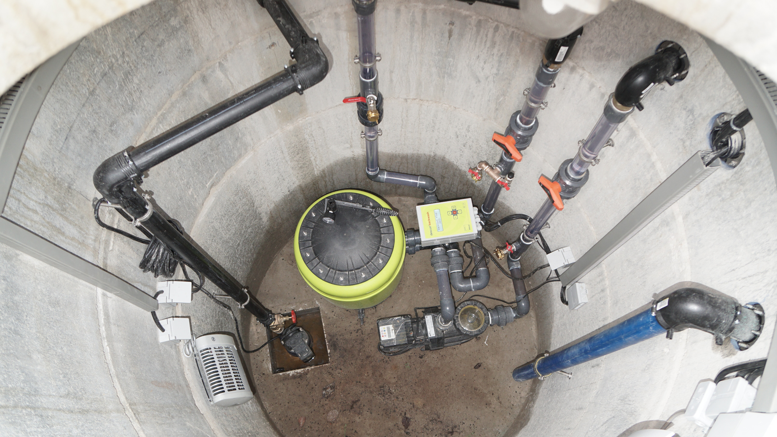 Im Technikschacht werden die Umwälzpumpe, die Wasserfiltereinheit und die zugehörige Steuerung installiert. Die Stromversorgung der Verbraucher sowie die entkoppelte Wasserstandsregelung inklusive automatischer Nachspeisung erfolgen über den oberirdischen Technikschrank.